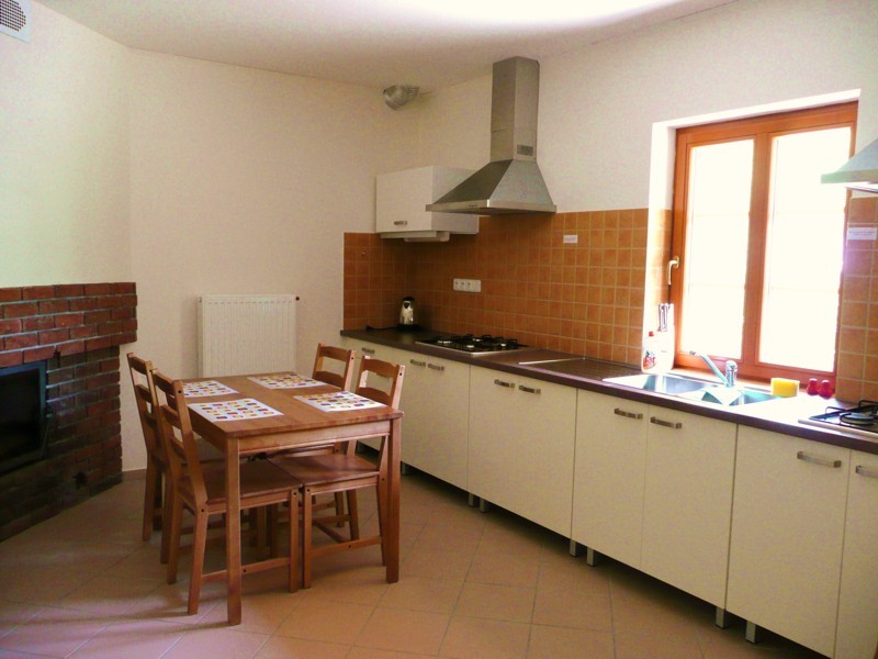 V objektu je možnost vaření a stravování ve společné kuchyni. Součástí kuchyně je i společná jídelna s krbem ( viz foto ).