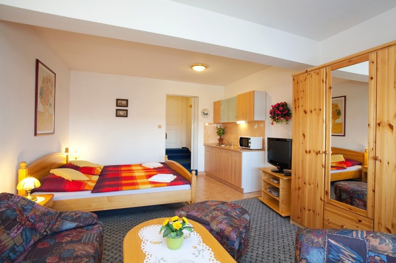 Pokoje levného ubytování v Českých Budějovicích jsou vybaveny vlastním WC, sprchou, satelitem, LCD televizí, minibarem a připojením k Wi-Fi internetu. Některé pokoje ubytování České Budějovice jsou vybaveny kuchyňkou s mikrovlnkou.