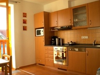 - OBYTNÁ MÍSTNOST je zařízena následovně: moderní kuchyňská linka se sklokeramickou deskou (4 plotýnky), elektrickou troubou, myčkou, mikrovlnkou s grilem, lednicí, kávovarem, rychlovarnou konvicí a veškerým potřebným nádobím (sada hrnců, pánvičky, sklenice, hrnky, sada nožů, jídelní příbory, talíře atd.), jídelní stůl pro 4 osoby, pohovka rozložitelná na pohodlné dvojlůžko. Pobyt v apartmánu zpříjemní LCD televizor s DVD přehrávačem a satelitním přijímačem.