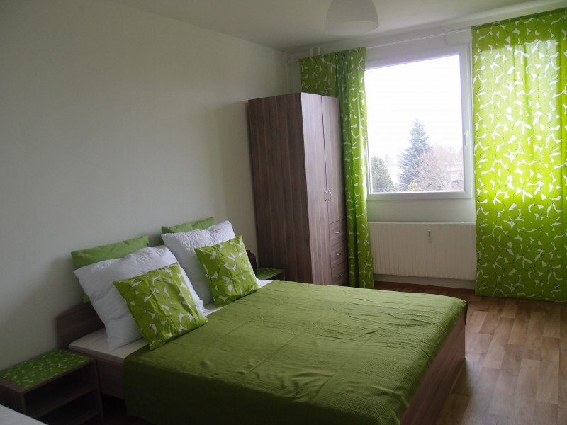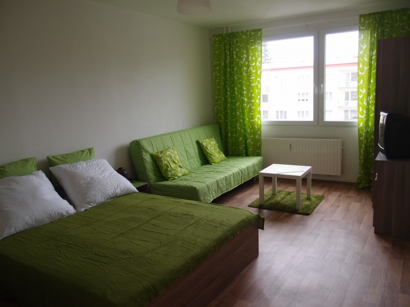 Apartmán nabízí 2 neprůchozí prostorné ložnice, ložnice A s manželskou postelí, jednolůžkem a rozkládacím křeslem, ložnice B s manželskou postelí, jednolůžkem a rozkládacím gaučem pro 2 osoby s TV