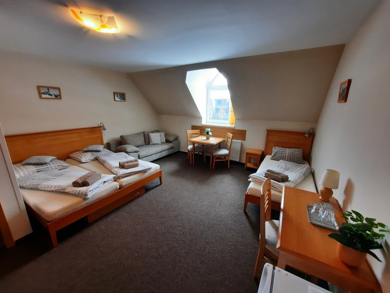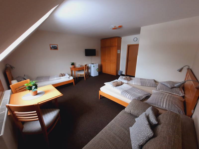 Nově vybudované pokoje v horním patře budovy jsou s krásným výhledem do okolí. K dispozici máme 5 pokojů. Na žádném pokoji nechybí vlastní soc. zařízení, televize ani lednička. Samozřejmostí je také WiFi připojení v celém objektu zdarma. V ceně pokoje je i snídaně v naší restauraci. Pro děti nabízíme zvýhodněné ceny!