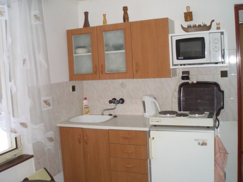 Kuchyně-malá kuchyňská linka s vybavením(3plotýnkový el.vařič,mikrovlnná trouba,varná konvice,lednice
