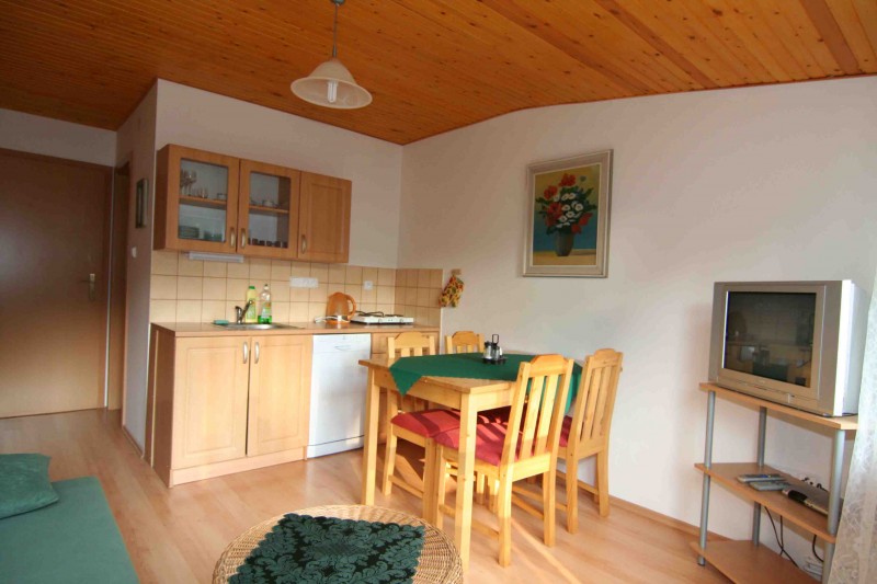 Čtyři dvoupokojová partmá v prvním patře, nově vybavená, mají samostatnou ložnici, obývací místnost s kuchyňským koutem, pohovkou, TV,SAT. Vlastní koupelna se sprchovým koutem.