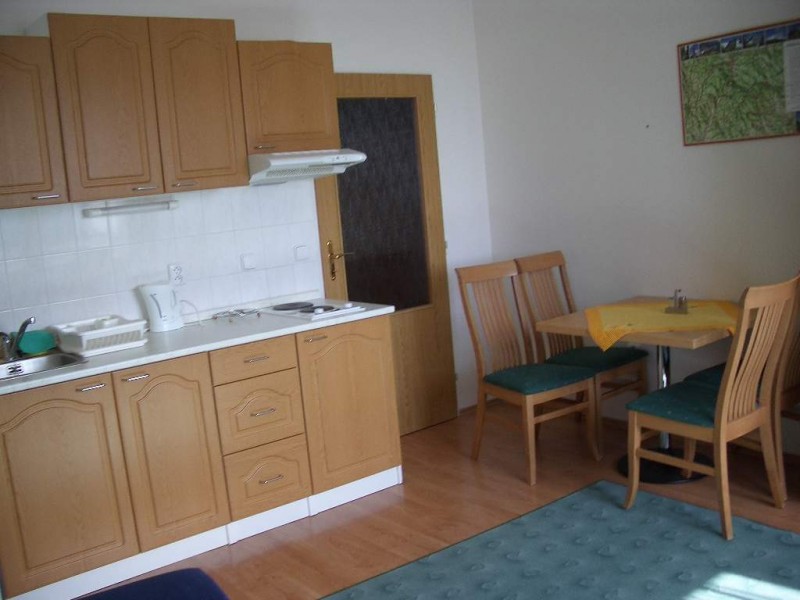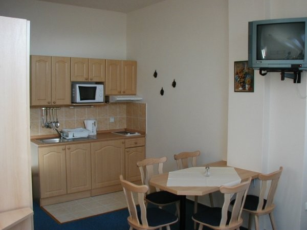 POPIS APARTMÁNŮ: předsíň, koupelna se sprchovým koutem, WC, kuchyňský a jídelní kout, obytná místnost s lůžky na spaní.