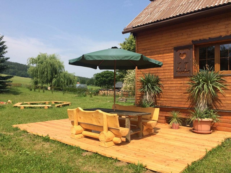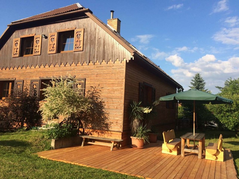 Krásná kompletně vybavená stylová chalupa s kachlovými kamny, dřevem obložená venku i uvnitř. Stojí na okraji obce, za chalupou pouze pastviny s koňmi a navazujícím lesem. Oplocená velká zahrada s ohništěm, venkovním posezením, pískovištěm, prolézačkami. Na zahradě velká bouda pro psa.