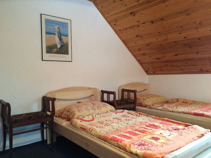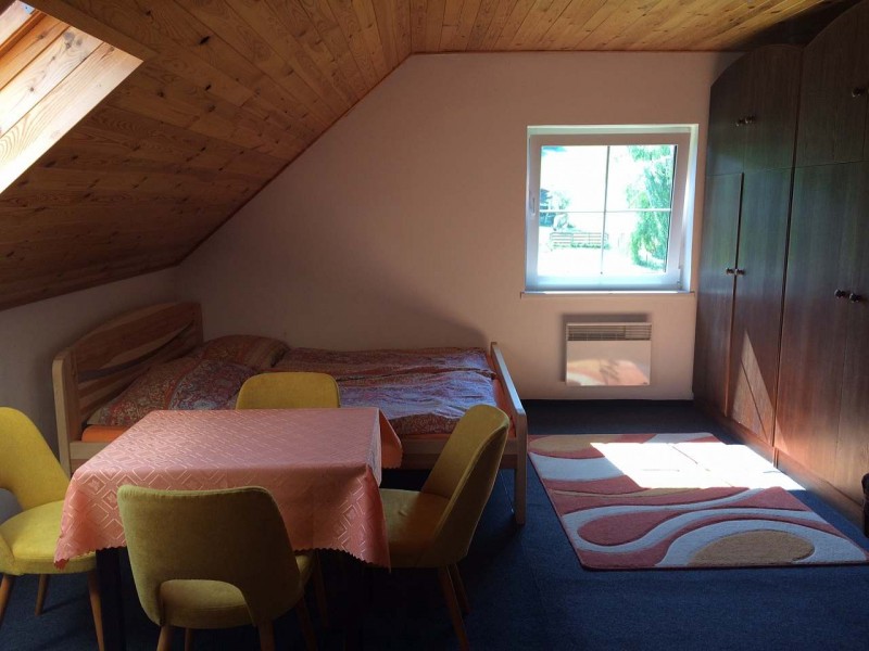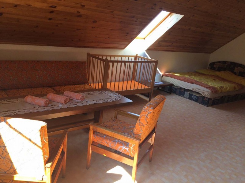 Ložnice a pokoje: V patře jsou umístěny 3 samostatné ložnice - 2 x 4 lůžka a 1 x 3 lůžka. První a druhá ložnice je vybavena manželskou postelí a dvěma samostatnými lůžky. Třetí ložnice má manželskou postel, rozkládací gauč a dětskou postýlku. V přízemí je velká společenská místnost, kuchyň.
