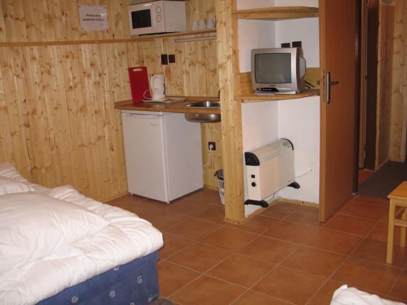 c) 7 čtyřlůžkových = 980,-Kč/den a 7 třílůžkových = 840,-Kč/den zařízených apartmánů s kuchyňkou, obývacím prostorem a ložnicí