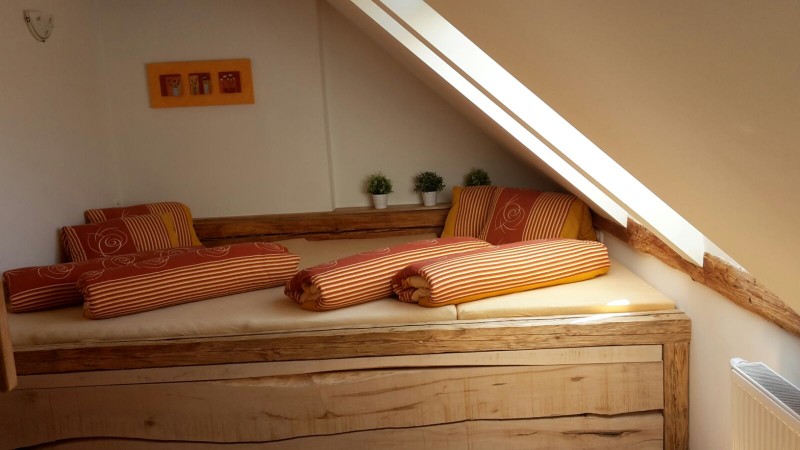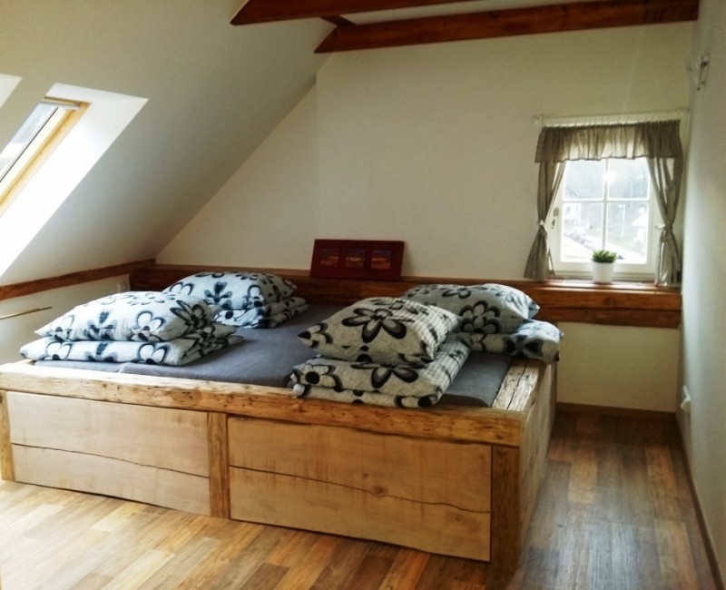 V našich pokojích nemáme standartní oddělená lůžka, ale na míru stavěné masivní postele vcelku - viz. fotogalerie. Pokoje jsou zařízeny vkusně a drží si svůj styl jako celá hájenka. Nachází se v 1. patře.