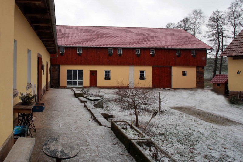 Rekonstruovaný statek, 8 pokojů se sociálním zázemím, dětské hřiště,trampolína,hřiště pro volný čas a sport,kryté sezení pod stodolou