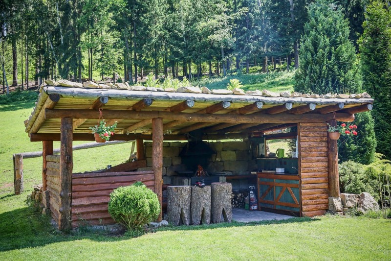 Vnitřní kuchyňka s jídelnou je vybavena mikrovlnou troubou, varnou konvicí, lednicí a běžným nádobím. Ve vnitřní kuchyňce potraviny lze pouze ohřívat. Vařit je možné ve venkovní kuchyni pod přístřeším, kde je ohniště, gril a dvouplotnový vařič.