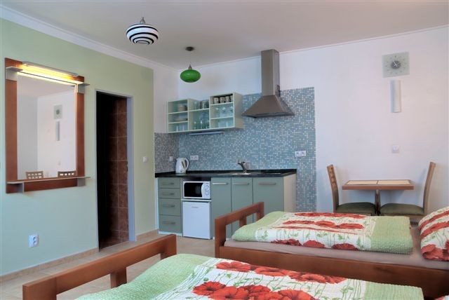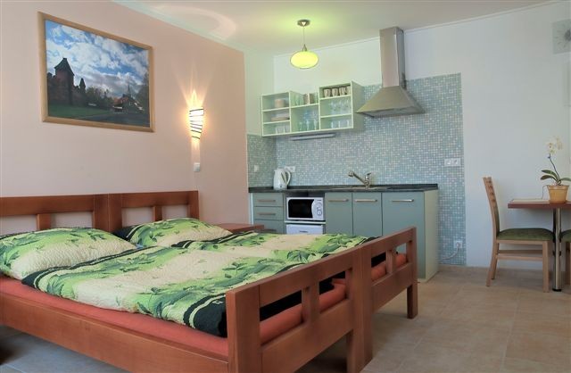 luxusní ubytování v soukromí, dvoulůžkový pokoj, klimatizace, LCD televizi, pracovní stůl, připojení k internetu (wi-fi) s rychlostí 10Mb/s, vlastní sociální zařízení, kuchyň, centrální topení s možností vlastní regulace, bezpečnostní dveře na vlastní heslo. Kuchyně: možnost vlastního vaření, kuchyňská linka s úplným vybavením, jídelní stůl, varná deska, lednice s mrazákem, rychlovarná konvice, mikrovlnná trouba, žehlička. Sociální zařízení: luxusní sprchový kout, toaleta, zrcadlo, umývadlo, žebrové topení na ručníky.