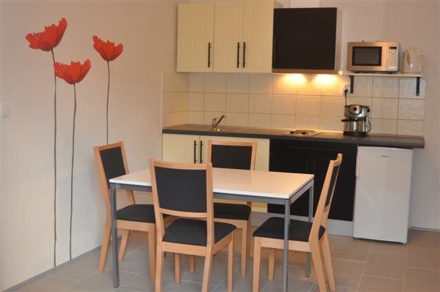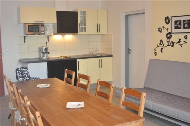 V apartmánu se nachází prostorná společenská místnost s kuchyňskou linkou a rozkládacím gaučem (2 přistýlková plnohodnotná lůžka), koupelna s WC a 2 ložnice po dvou a třech lůžkách. Z apartmánu je krásný výhled do zahrady a do kraje.