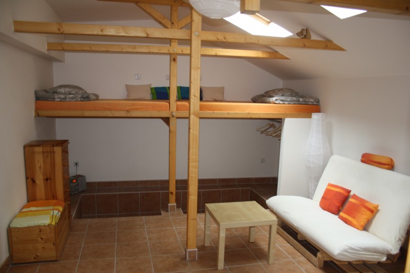 Společenská místnost: 2 x 1,5 lůžka, sedací souprava (rozkládací dvojlůžko), 2x křeslo, stolek, rádio, krbová kamna