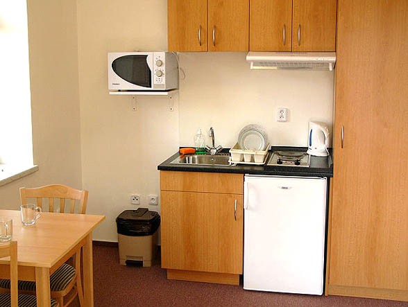 Každý apartmán má vlastní sociální zařízení: WC, sprchový kout, ... ... a kuchyňský kout: varná dvou plotna, mikrovlnka, chladnička, varná konvice, nádobí. Celý objekt je vytápěn elektrickými přímotopy - na pokojích s možností vlastní regulace. Podlahy pokojů a chodeb pokrývá zátěžový koberec. Každý apartmán je vybaven zásuvkou pro připojení TV. Televizory se zapůjčují za poplatek 60 Kč/týden.