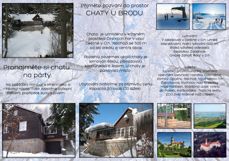 Příjměte pozvání do CHATY U BRODU, která je umístěna v krásném prostředí Olrických hor v obci Deštné v O.h.. Nachází se 500 m od ski areálu a centra obce. Chata má rozlehlý pozemek, který je lemován lesem a říčkou.