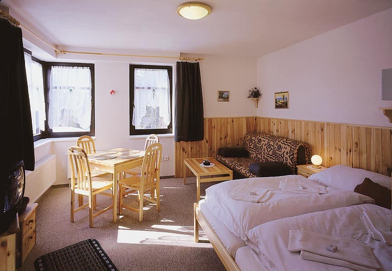 Pronajímáme 4 lůžkové***apartmány , sestávajících z velké obývací ložnice s jídelním koutem, kuchyňkou, příslušenstvím a předsíní. Apartmány jsou umístěny v novém moderním objektu a sousedí spolu. Jsou spojeny společnou chodbou, kam se nechají uložit kola nebo lyže.