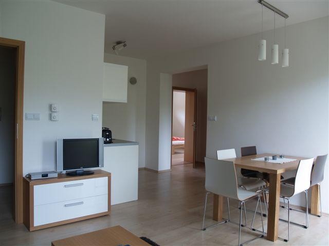 Vstup do apartmánů má každý zákazník uzamykatelný ze společné chodby.Do apartmánu se vstupuje předsíní s vestavnou skříní, věšákem, kde je možné si odložit obuv.Dále se pokračuje do velké obytné místnosti s kuchyňskou linkou vybavenou, mikrovlnou troubou, sklokeramickou deskou, rychlovarnou konvicí, topinkovačem, toustovačem a komplet nádobím pro 6 osob. Zajímavým prvkem je masivní jídelní stůl s židlemi, v druhé polovině je rozkládací sedací souprava, konferenční stolek a komoda na TV SAT. U každého apartmánu jsou dvě samostatné ložnice, jedna s manželským dvojlůžkem a nočními stolky, druhá ložnice s dvěma samostatnými lůžky a také nočními stolky. Koupelny jsou vybaveny umyvadlem, sprchovým boxem a WC. Vytápění a ohřev užitkové vody je možno samostatně regulovat pro každý apartmán a pokoj samostatně dle potřeb hostů. Používaní internetu ve všech místnostech bez omezení.Telefon s pevnou linkou a možností výhodného volání do zahraničí je na vyžádání telefoní číslo je 00420????.