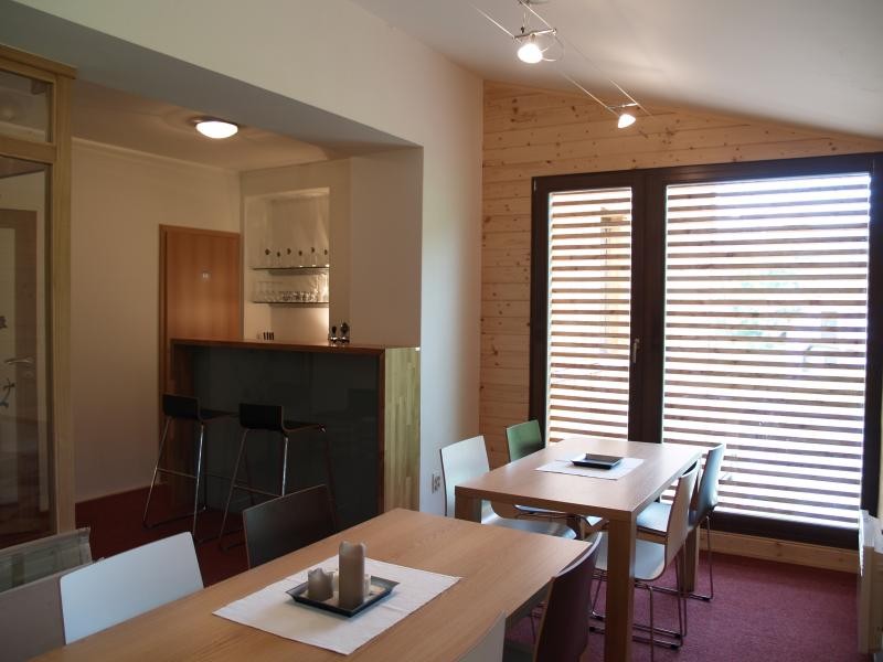 Apartmán - standard č.1 - vybavení apartmánu se neodlišuje od standardů v ostatních apartmánech. Je hned v prvním podlaží a po překonání šesti schodů z parkoviště je již částečně bezbariérový. Všude jsou minimálně 80 cm široké dveře včetně koupelny, která má také částečně bezbariérový zařízení. Přístup na louku kolem apartmánu je zase částečně bezbariérový a jen s doprovodem fyzicky zdatné doprovodné osoby z důvodu většího svahu než povoluje norma pro imobilní zákazníky.