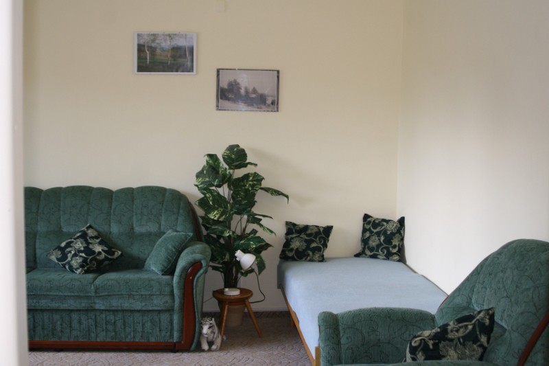 Pokoj 19m2 s vchodem na terasu a výhedem na Hromovku. Vybavený 2 válendami, 1 rozkládací pohovkou, 1 menší pohovkou a pohodlným křeslem. Vše je ve stylu, pěkné, neopotřebované. viz foto