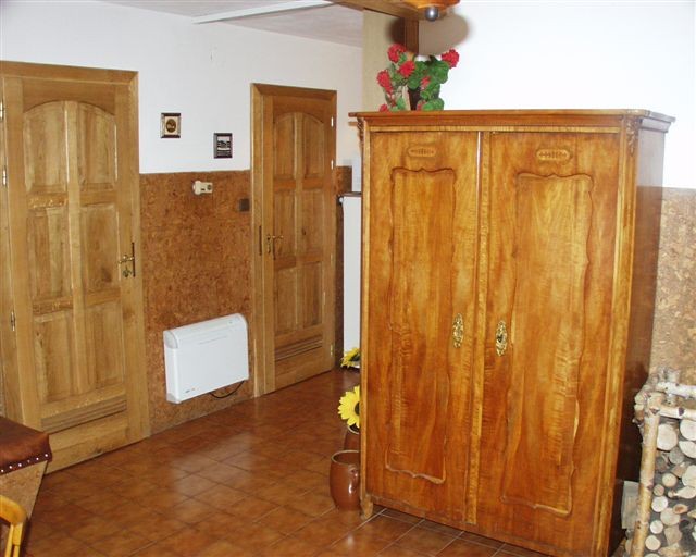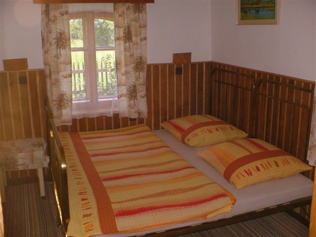 Přízemí objektu je nově po rekonstr. Nabízí jeden dvoulůžkový a jeden čtyřlůžkový pokoj s možností přistýlky a na přání dětskou postýlku dále společné wc s koupelnou a samostatné wc. Příjemně zařízená hlavní místnost v roubeném stylu slouží jako jídelna.