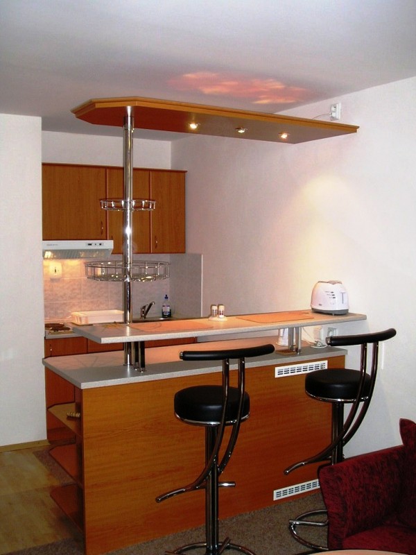 · Kuchyňa je plne vybavená kuchynským riadom. K dispozícií je elektrická dvojplatnička nad ktorou je digestor, mikrovlnná rúra a chladnička zabudovaná v barovom pulte, rýchlovarná kanvica a hriankovač.