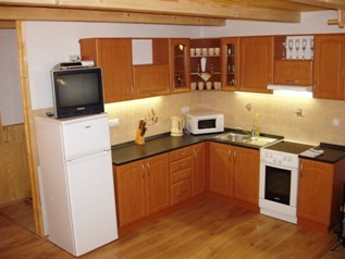 Kompletně zařízená kuchyně, elektrický sporák, lednička, mirkovlnná trouba, rychlovarná konvice