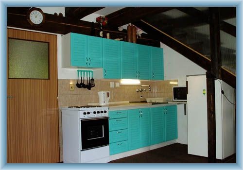 Rekreační chalupa se třemi komfortně zařízenými byty, každý SE SAMOSTATNÝM VCHODEM. První byt se nachází v levé části chalupy, druhý byt v pravé části chalupy, třetí byt v podkroví. Andělka má tři samostatné bytové jednotky a je vhodná jak pro rodiny, tak i pro skupinky. BYT ČÍSLO 1: Kapacita 7 lůžek + 1 přistýlka/2 ložnice 4 a 3+1 lůžko/. Bytu dominuje velká obývací místnost s krbovými kachlovými kamny, jídelním a kuchyňským koutem a schodištěm do prvního patra. V přízemí je ještě malá předsíň, ze které je přístup do koupelny se sprchovým koutem a záchodem. V prvním patře se nacházejí dvě ložnice - se třemi a čtyřmi lůžky a přistýlkou. Vytápění bytu je elektrické (akumulační kamna). Vybavení: elektřina, teplá a studená voda, elektrický sporák s pečící troubou, lednička s mrazákem, mikrovlnná trouba, varná konvice, nádobí,2X barevný televizor, koberce. BYT ČÍSLO 2: Kapacita 8 lůžek/2 ložnice v každé 4 lůžka/. Do bytu se vchází přes verandu a chodbu, z níž vedou dveře do obývací místnosti, ložnic a koupelny. Součástí obývací místnosti je i kuchyňský kout. Obývák zároveň také slouží jako jídelna. Ložnice jsou 2,každá má 4 lůžka. Poslední místností je koupelna se sprchovým koutem a záchodem. Vytápění bytu je elektrické (akumulační kamna). Vybavení: elektřina, teplá a studená voda, elektrický vařič s dvěma plotýnkami, lednička s mrazákem, varná konvice, remoska, mikrovlnná trouba, nádobí,2x barevný televizor, koberce. BYT ČÍSLO 3: Kapacita 4 lůžka, 1 přistýlka. Do bytu se vchází samostatným vchodem po schodišti. Byt je tvořen samostatnou ložnicí se 4 lůžky a případnou přistýlkou a dále obývacím pokojem s kuchyňským koutem. Z okna výhled na SJEZDOVKU. Součástí bytu je i koupelna s vanou a záchodem. Vytápění bytu je elektrické (akumulační kamna). Vybavení : elektřina, teplá a studená voda, elektrický vařič s dvěma plotýnkami, lednička, mikrovlnná trouba, varná konvice, nádobí, barevný televizor, koberce.