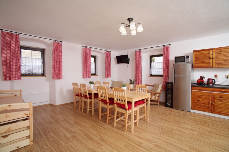 • 1 velká společná místnost s kuchyňskou linkou, televizí, vinotékou, rozkládací postelí, jídelním a relaxačním koutem