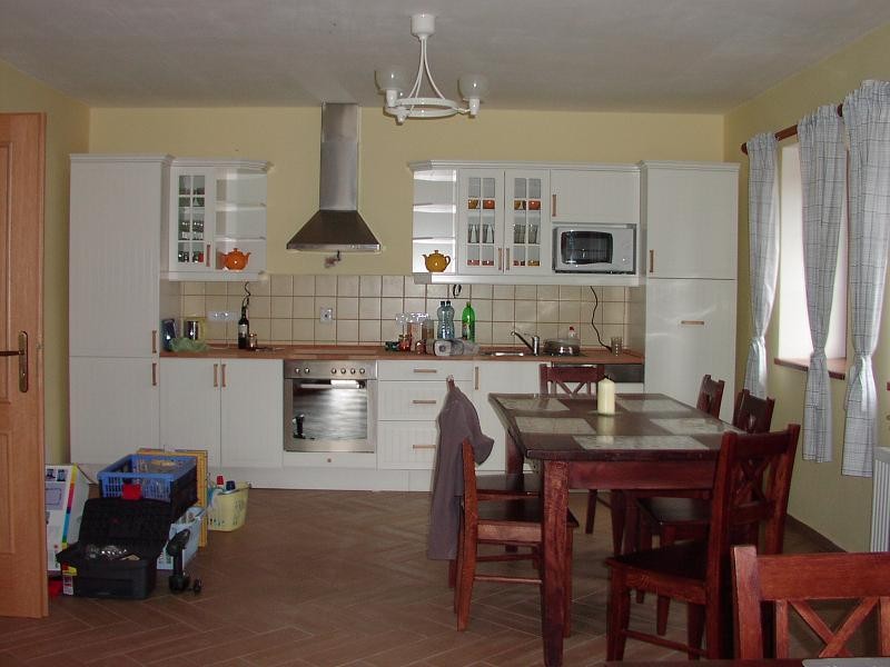 V přízemí jsou 2 apartmány po 2 lůžkách a 1 přistýlce (celková kapacita přízemí chaty: 4+2) a pro zpříjemnění pobytu je Vám na patře k dispozici posezení u krbu, které je součástí prostorné jídelny, která disponuje plně vybavenou vestavěnou kuchyní. Odtud je též vchod na zastřešenou terasu.