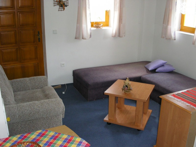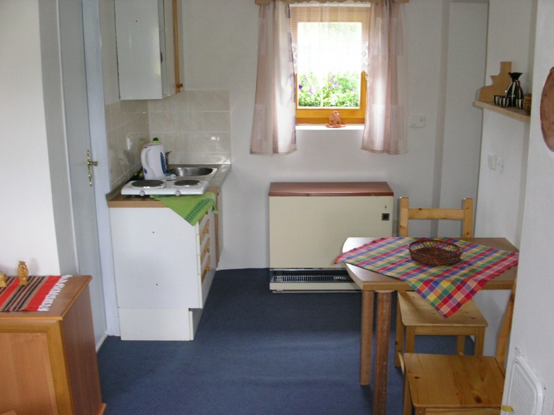 Apartmán č. 1 v přízemí pro 2 až 3 osoby, je z něj přímo vstup na terasu, kuchyňský kout,jídelní stůl, koupelna , WC, komora.