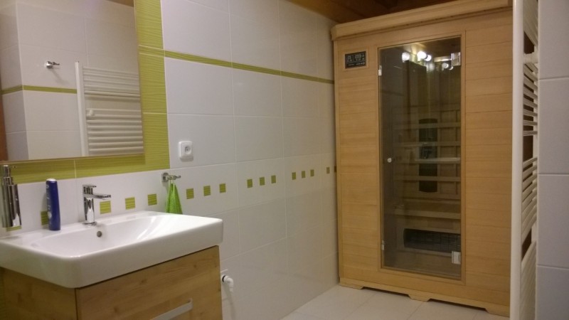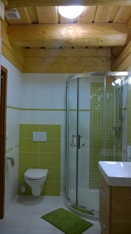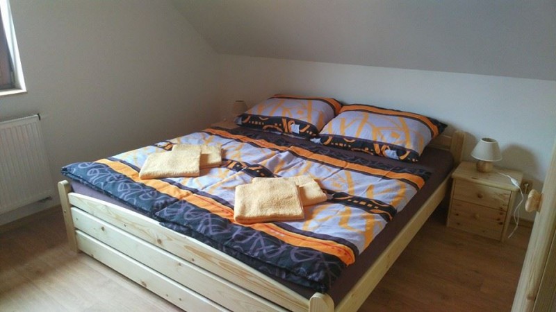 Srub nabízí ubytování pro 16osob. V patře jsou 4ložnice po 4 lůžkách/1xmanželská postel,1xdvoupatrová postel/,