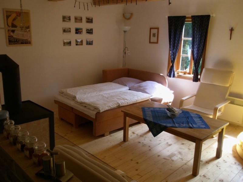 obývací místnost s krbovými kamny, BTV + SAT, DVD, mini věž MP3, různé společenské hry pro děti i dospělé, rozkládací sedací souprava (2x lůžko)