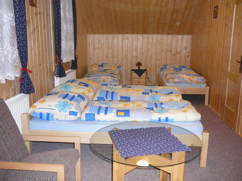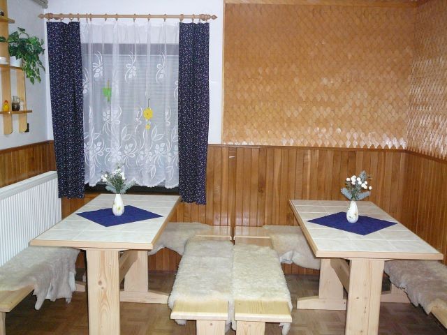 Ložnice a pokoje: Pension nabízí 4 samostatné pokoje ( 1x5 lůžkový, 2x3 lůžkový a 1x4 lůžkový), každý má vlastní sociální zařízení a barevnou TV.