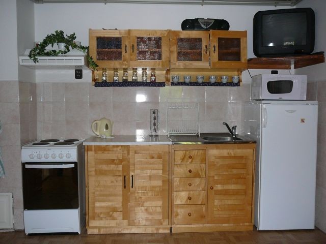 K dispozici zde máte vybavenou kuchyň (el. sporák, lednice, mikrovlnná trouba, varná konvice, nádobí) se společenskou místností ( TV, rádio), která je určena pro všechny 4 pokoje.